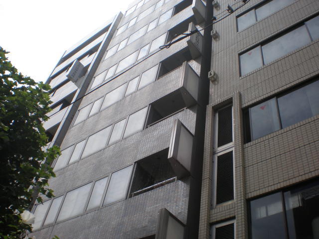 1985年竣工のオフィスビル、グレーのタイル張りの外観です。新耐震基準をクリアしています。
